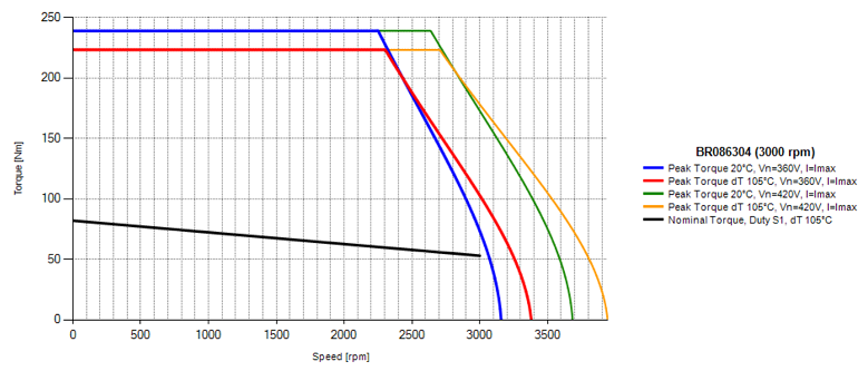 I valori di coppia e potenza si riferiscono al motore flangiato in posizione orizzontale (flangia in acciaio 500x500x40 mm). PWM minimo 8kHz, tensione DC bus di prova ≤ 560 Vdc non controllato, testato con resolver