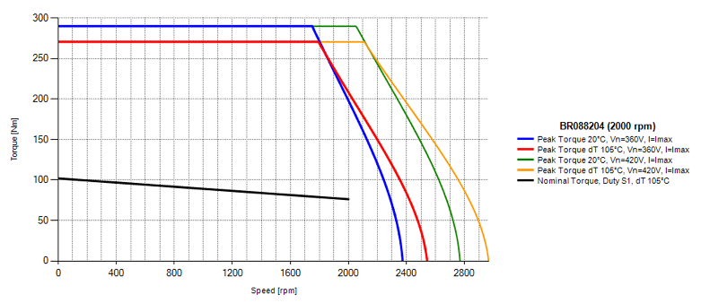 I valori di coppia e potenza si riferiscono al motore flangiato in posizione orizzontale (flangia in acciaio 500x500x40 mm). PWM minimo 8kHz, tensione DC bus di prova ≤ 560 Vdc non controllato, testato con resolver