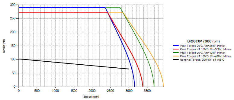 I valori di coppia e potenza si riferiscono al motore flangiato in posizione orizzontale (flangia in acciaio 500x500x40 mm). PWM minimo 8kHz, tensione DC bus di prova ≤ 560 Vdc non controllato, testato con resolver