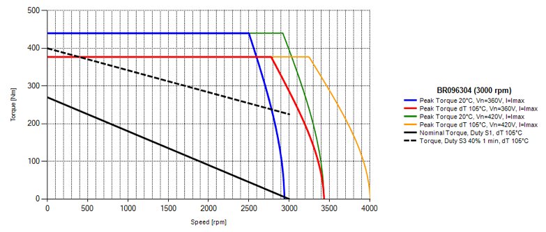 I valori di coppia e potenza si riferiscono al motore flangiato in posizione orizzontale (flangia in acciaio 500x500x40 mm). PWM minimo 4kHz, tensione DC bus di prova ≤ 560 Vdc non controllato, testato con resolver